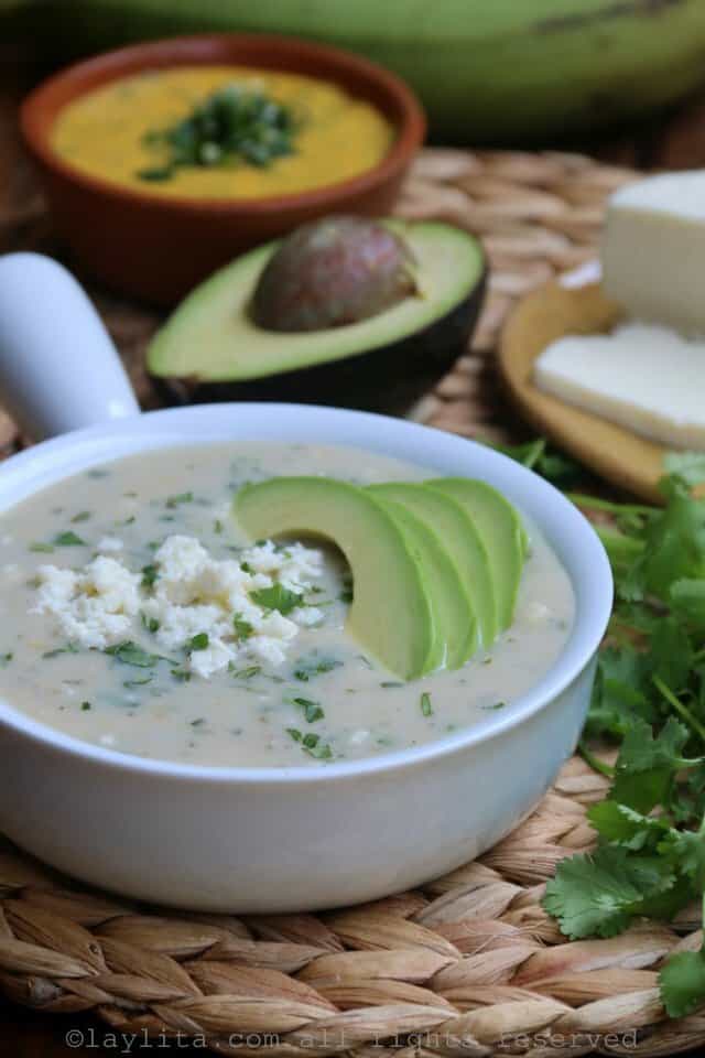 This Green Banana Soup called Repe Lojano by Laylita's Recipes is a traditional recipe from the province of Loja in Ecuador. This appetizing creamy soup made with green bananas is served with avocado slices, cheese and aji.