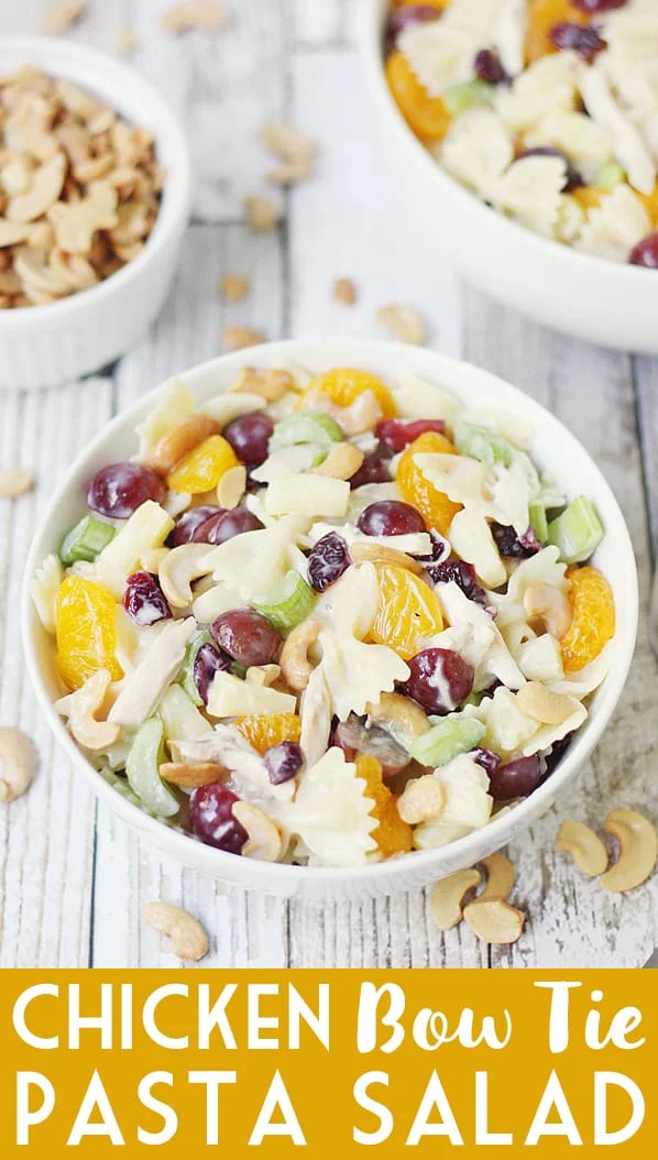 Chicken bow tie pasta salad is the perfect summer salad! It combines so many delicious ingredients with the crunch of cashews and creamy coleslaw dressing.