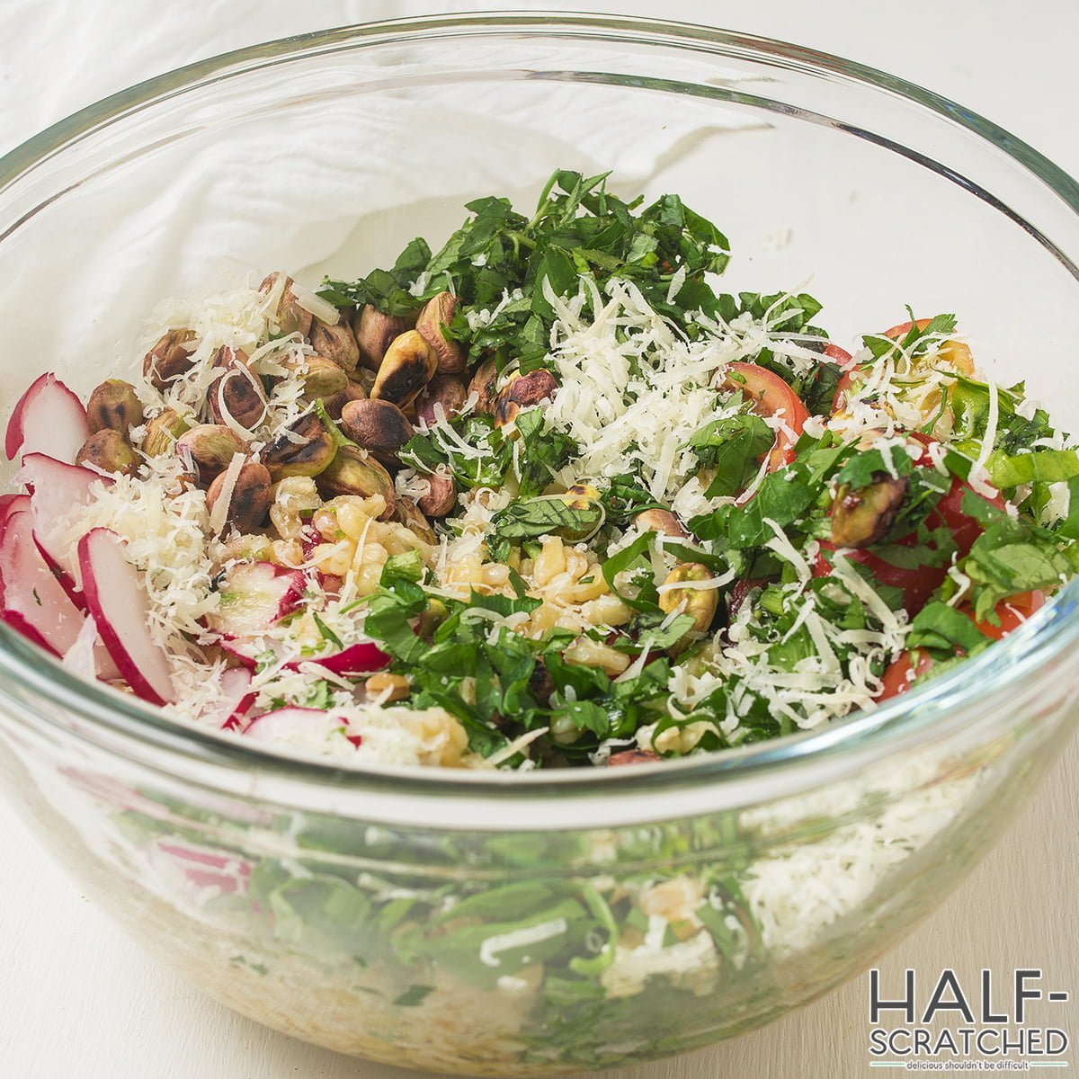 5. Stir in the pistachios, chopped parsley, mint, tomatoes, and radishes.